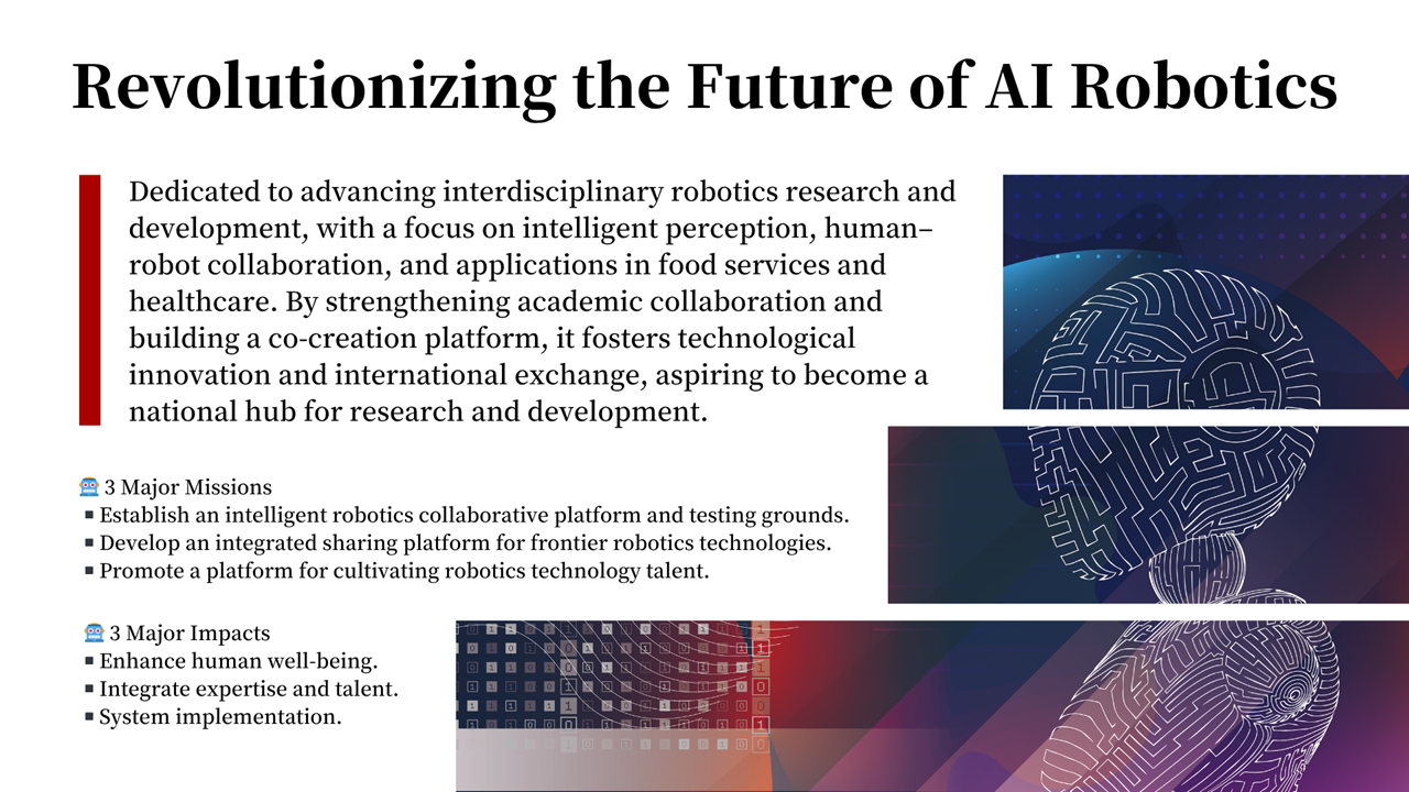 In alignment with the Executive Yuan's 'New Ten Major AI Infrastructure Projects' and 'Developing the smart robotics industry,' the National Center for AI Robotics (NCAIR) serves as a cornerstone to harness the synergy of domestic and international robotics ecosystems across industry, academia, and research. NCAIR is dedicated to developing cutting-edge technologies, cultivating talent with interdisciplinary system development capabilities, and incubating startups. NCAIR→