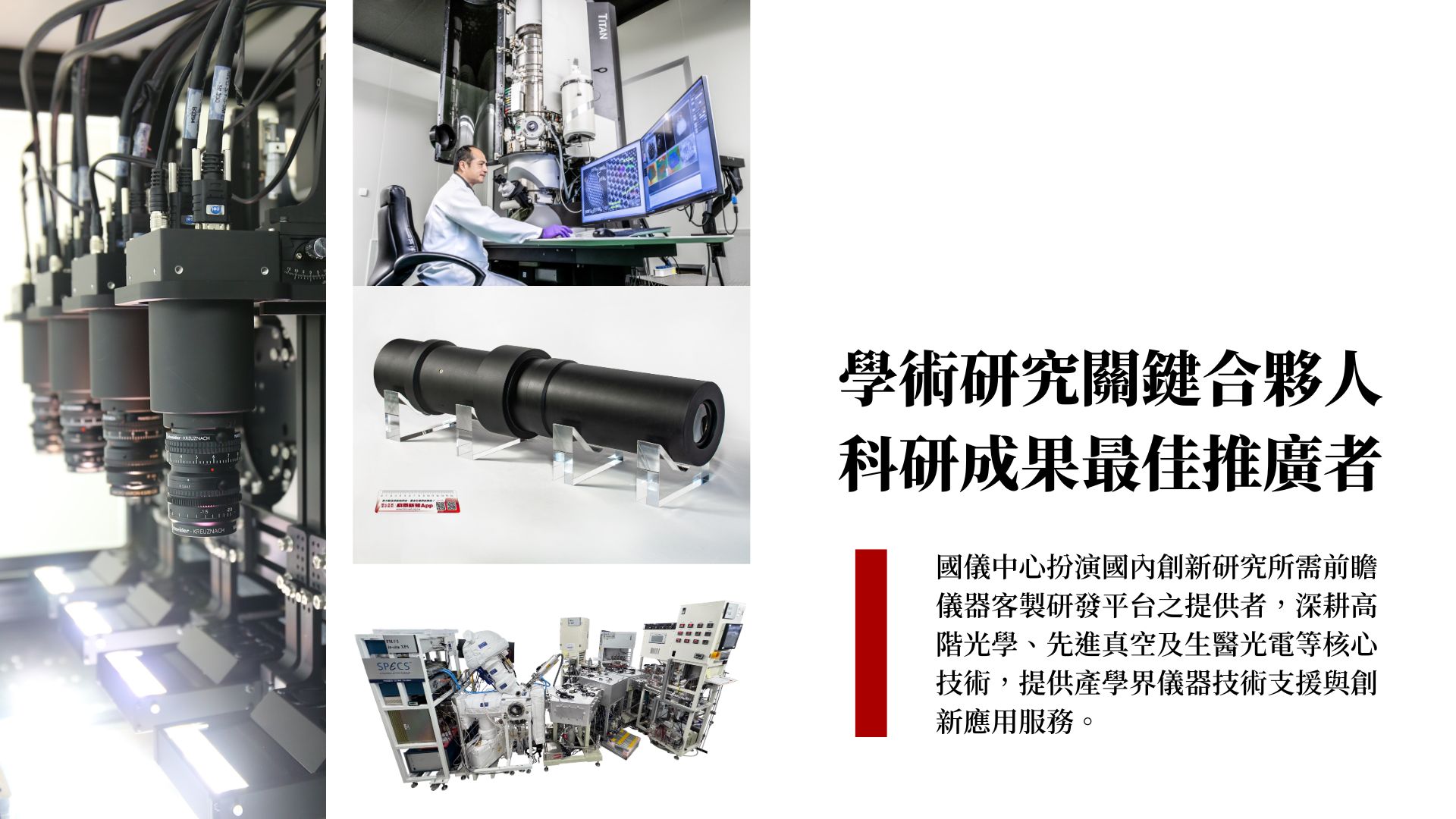 配合國家科技政策與產業經濟發展需求,國研院國家儀器科技研究中心(National Center for Instrumentation Research, NCIR)協助學術界開發前瞻研究所需之特用實驗儀器設備,以創新工程品化及工程服務化為方向,落實將研發創意轉化至產業應用,有效促成前瞻科學研究成果與新興產業之發展。國儀中心→