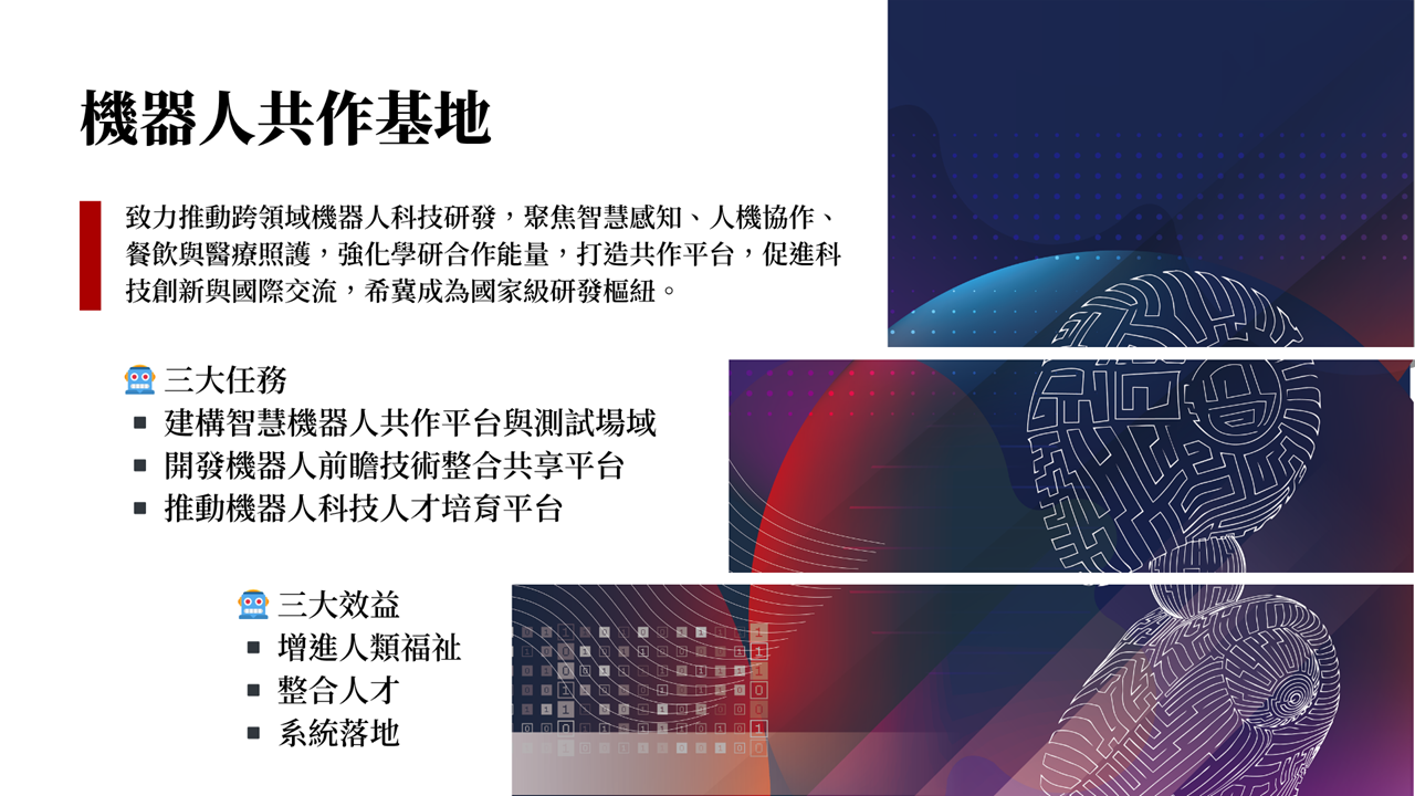 配合行政院「AI新十大建設推動方案」及「智慧機器人產業推動方案」以智慧機器人研究中心為基石,結合國內外產學研機器人生態系能量,開發前瞻技術,同時培育具跨領域系統開發能力之人才,並育成新創公司。 機器人中心→
